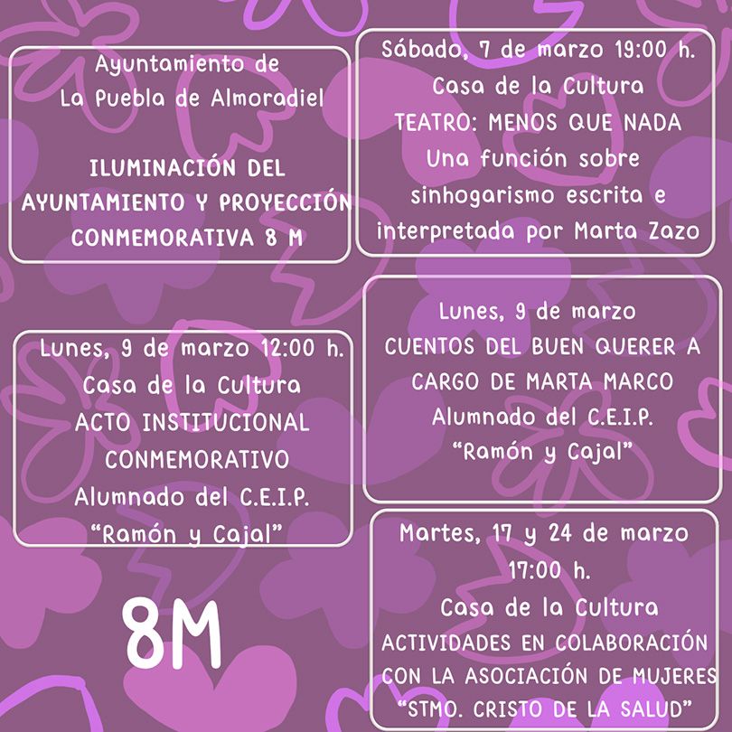 El lunes 9 de marzo, a las 12:00 h, tendrá lugar el acto institucional conmemorativo en la Casa de la Cultura, con la participación del alumnado del C.E.I.P. “Ramón y Cajal”. Ese mismo día se celebrará también la actividad “Cuentos del buen querer”, a cargo de Marta Marco.