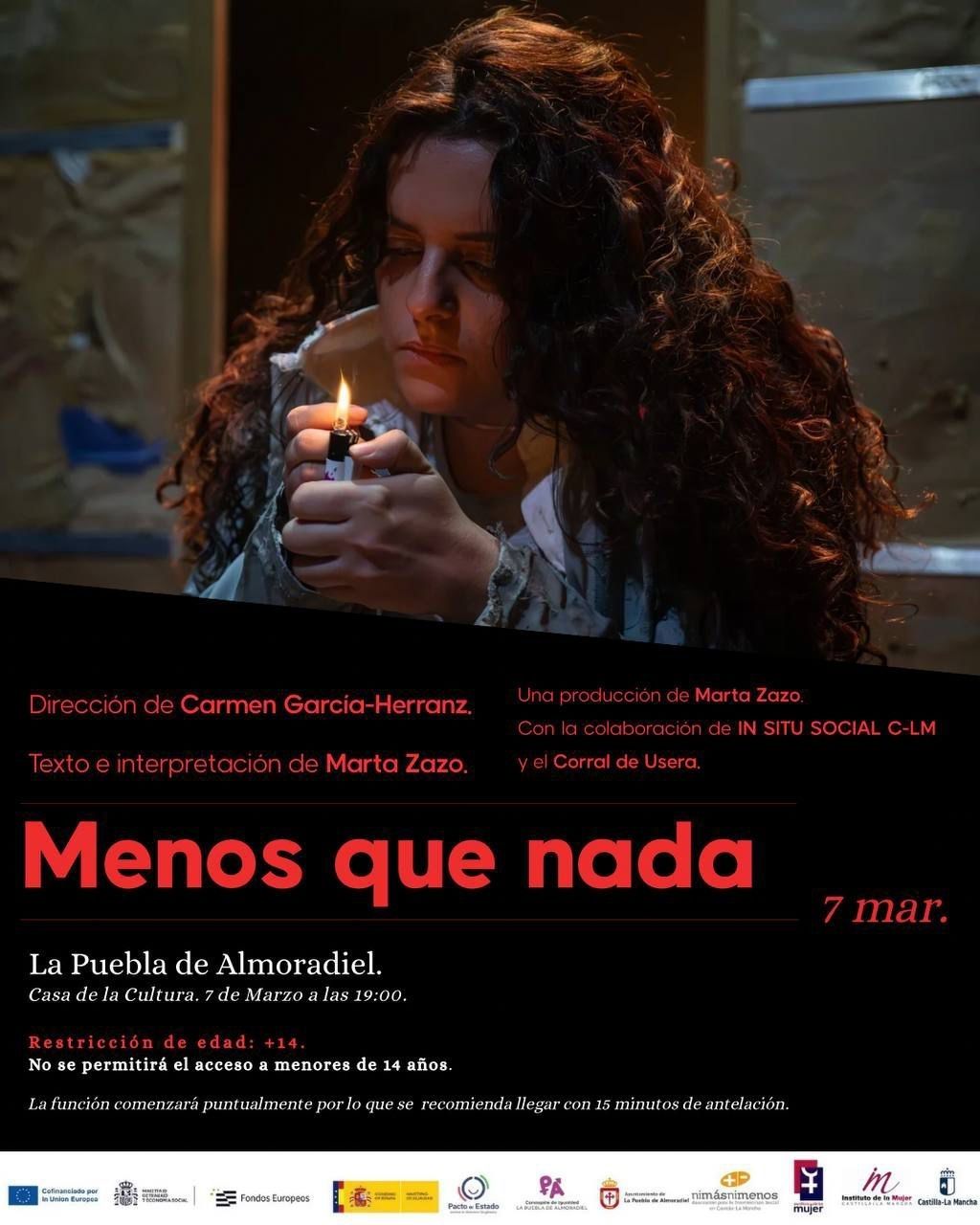 El sábado 7 de marzo, a las 19:00 h, la Casa de la Cultura acogerá la representación teatral “Menos que nada”, una función sobre sinhogarismo escrita e interpretada por Marta Zazo. No se permitirá el acceso a menores de 14 años.