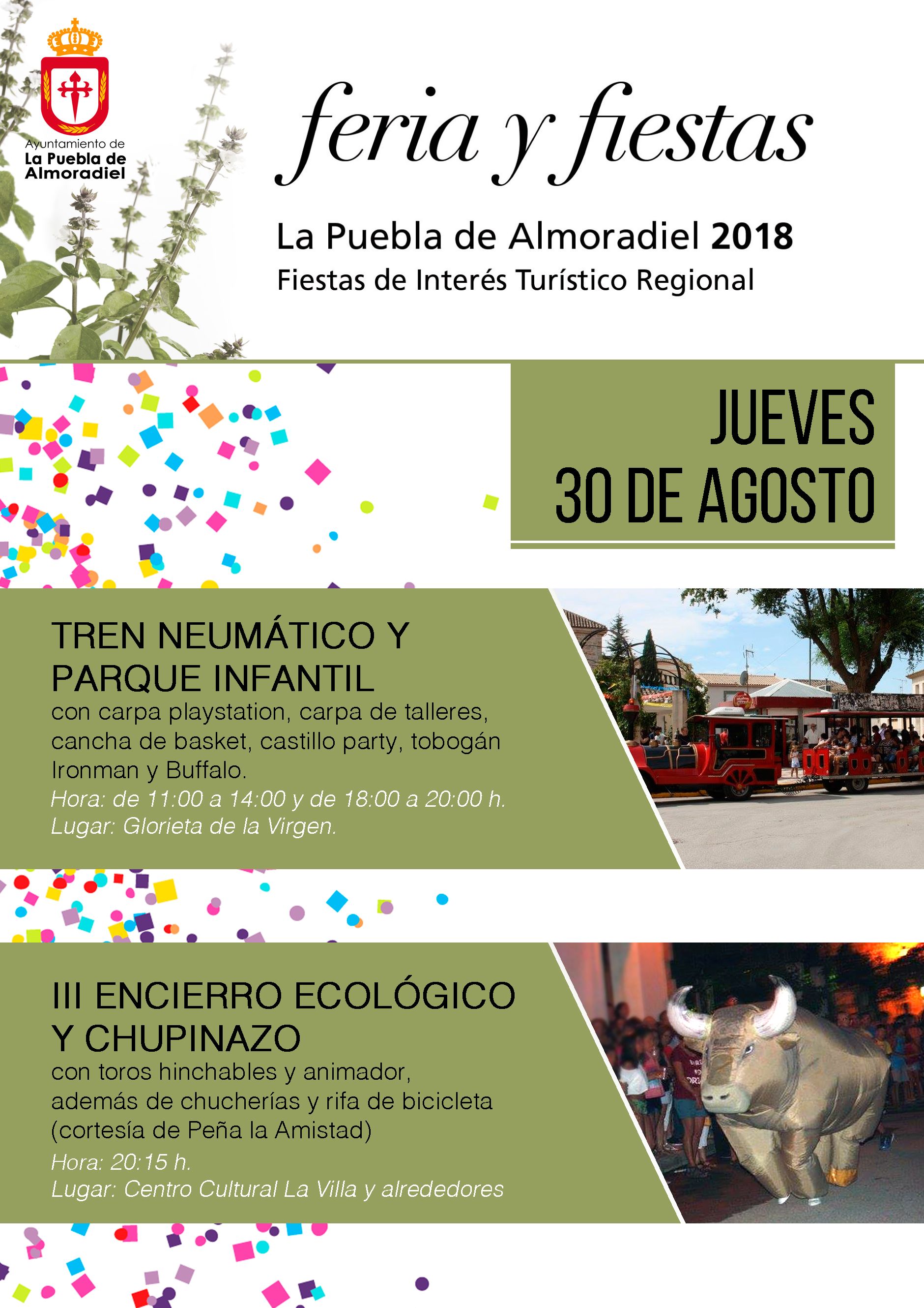El 30 de agosto, desde las 11 de la mañana tendremos tren turístico, hinchables, consolas, etc, y por la tarde “Encierro ecológico” y chupinazo, todo esto en la Glorieta de la Virgen.
