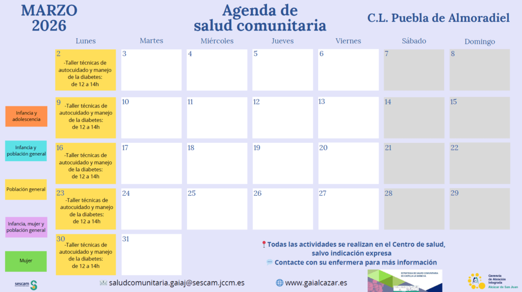 El Ayuntamiento de La Puebla de Almoradiel informa a la ciudadanía de la programación de actividades de Salud Comunitaria organizada por la Gerencia de Atención Integrada de Alcázar de San Juan (SESCAM), que se desarrollará durante el mes de marzo de 2026 en nuestro Centro de Salud.