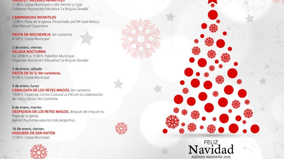 - Nochevieja: Juegos y Talleres Infantiles (31 de diciembre, 11:00 h.) seguidos de la Fiesta de Nochevieja (01:00 h., Carpa Municipal).