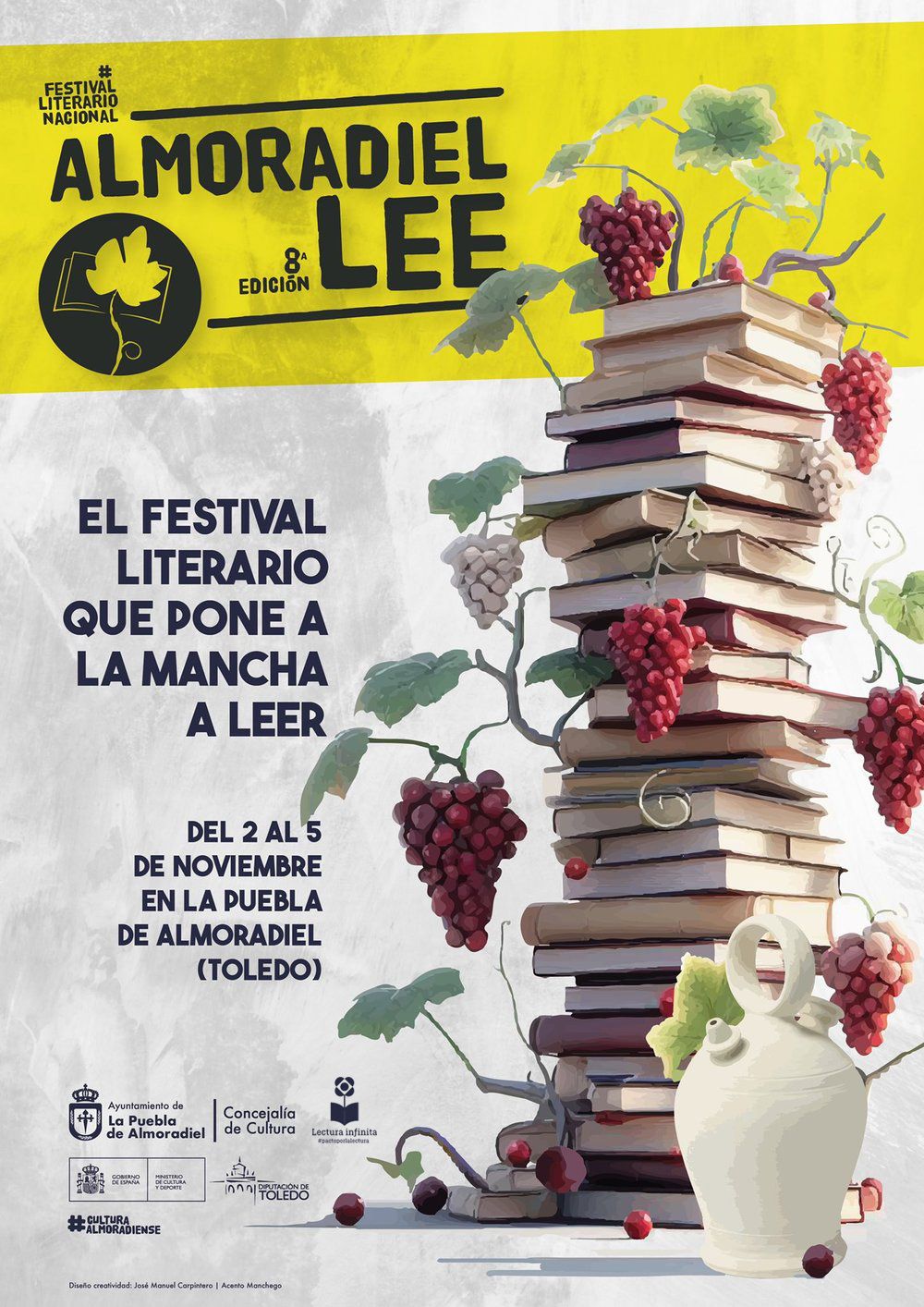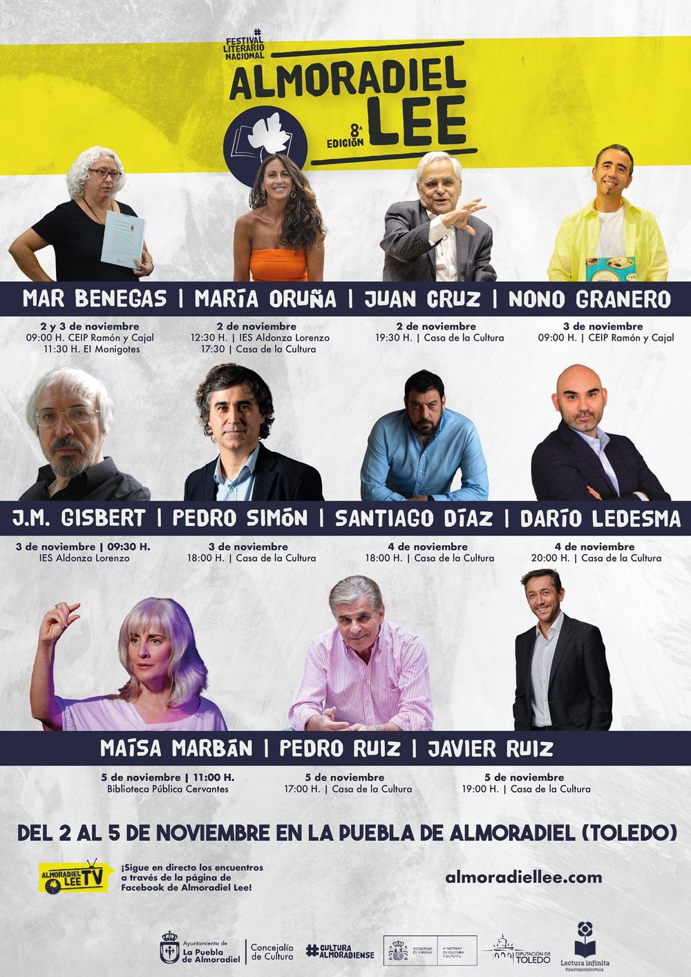 El Festival Literario Nacional “Almoradiel Lee” se celebrará del 2 al 5 de noviembre de 2023, siendo esta su octava edición. Este año visitarán La Puebla de Almoradiel los siguientes autores y autoras: Javier Ruiz, Pedro Ruiz, Maísa Marbán, Darío Ledesma, Santiago Díaz, Pedro Simón, J.M. Gisbert, Nono Granero, Juan Cruz, María Oruña y Mar Benegas