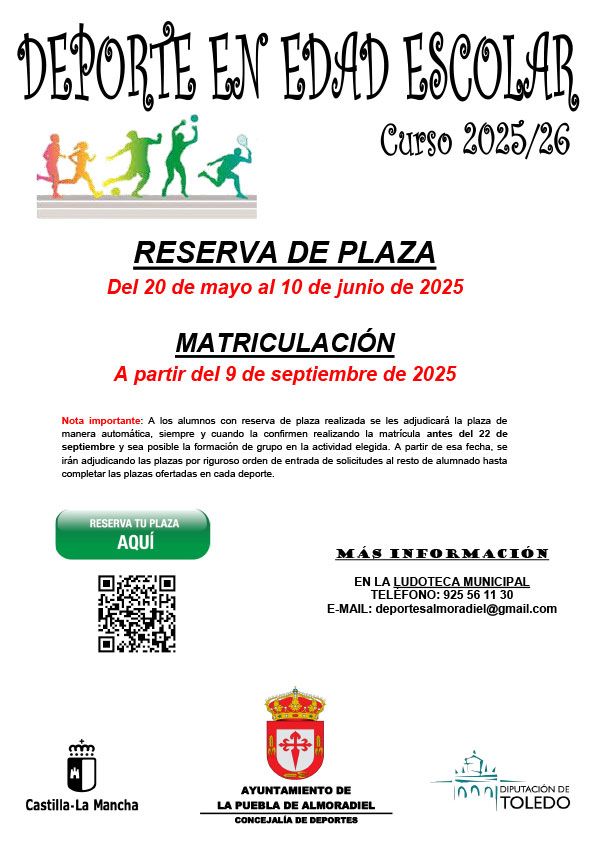Desde el 20 de mayo hasta el 10 de junio de 2025, se abrirá el periodo de reserva de plaza para todas las actividades deportivas en edad escolar. Esta es tu oportunidad de asegurar tu lugar en tus deportes favoritos.