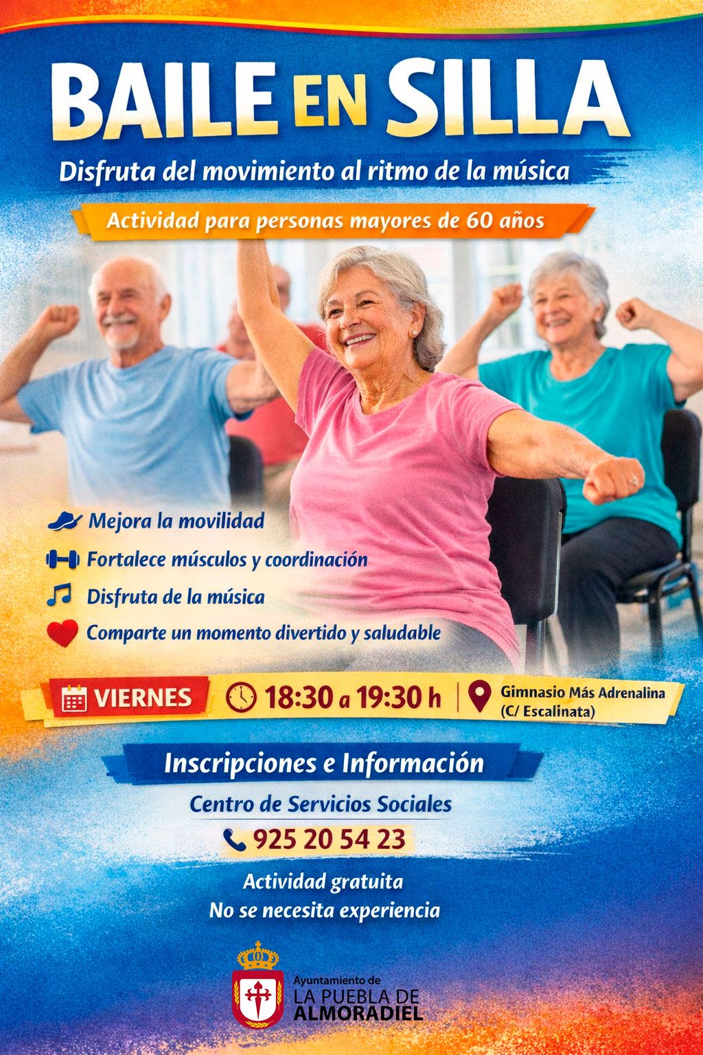 La Concejalía de Bienestar Social del Ayuntamiento de La Puebla de Almoradiel, a través del Centro Social, pone en marcha una nueva actividad dirigida a las personas mayores del municipio: Baile en silla, una propuesta pensada para mantenerse activo de forma segura y divertida.