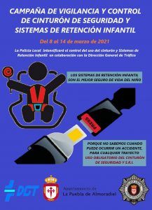 Entre los días 8 y 14 de marzo los agentes de Policía Local de nuestra localidad realizarán una CAMPAÑA DE VIGILANCIA Y CONTROL DEL USO DEL CINTURÓN DE SEGURIDAD Y DE LOS SISTEMAS DE RETENCIÓN INFANTIL (SRI). Dicha campaña se llevará a cabo debido al convenio de colaboración del Ayuntamiento de La Puebla de Almoradiel con la Dirección General de Tráfico (DGT).