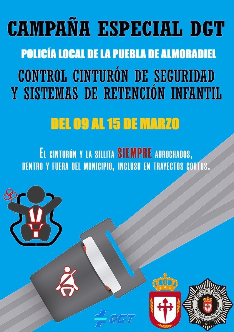La Policía Local de La Puebla de Almoradiel se suma a la campaña especial de vigilancia y control del uso del cinturón de seguridad y de los sistemas de retención infantil promovida por la Dirección General de Tráfico (DGT), que se desarrollará del 9 al 15 de marzo.