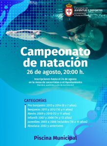 El 26 de agosto, a las 20:00 h. se celebrará el Campeonato de Natación organizado por la Concejalía de Juventud y Deportes. Inscripciones hasta el 24 de agosto en la mesa de los socorristas o en las oficinas del Ayuntamiento