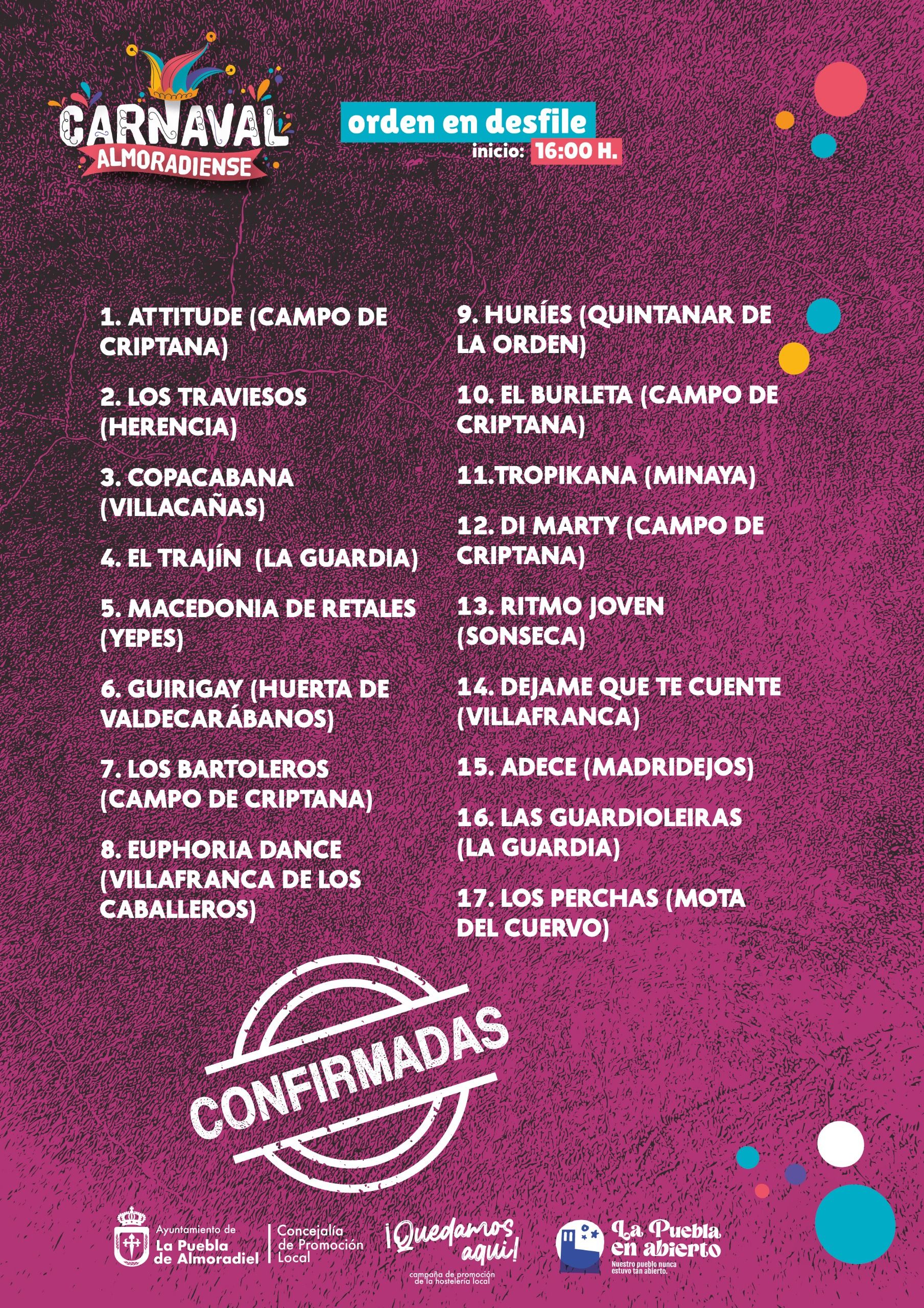 Diecisiete comparsas llegadas de todos los puntos de la región desfilarán por nuestras calles, con actuación final en el recinto ferial donde se han instalado gradas en pendiente con aforo para 250 espectadores. Además, se habilitará un espacio de máxima visibilidad para personas con discapacidad y se instalarán sillas para el público general. ¡Más que ningún año, el ánimo y aplausos del público serán necesarios!