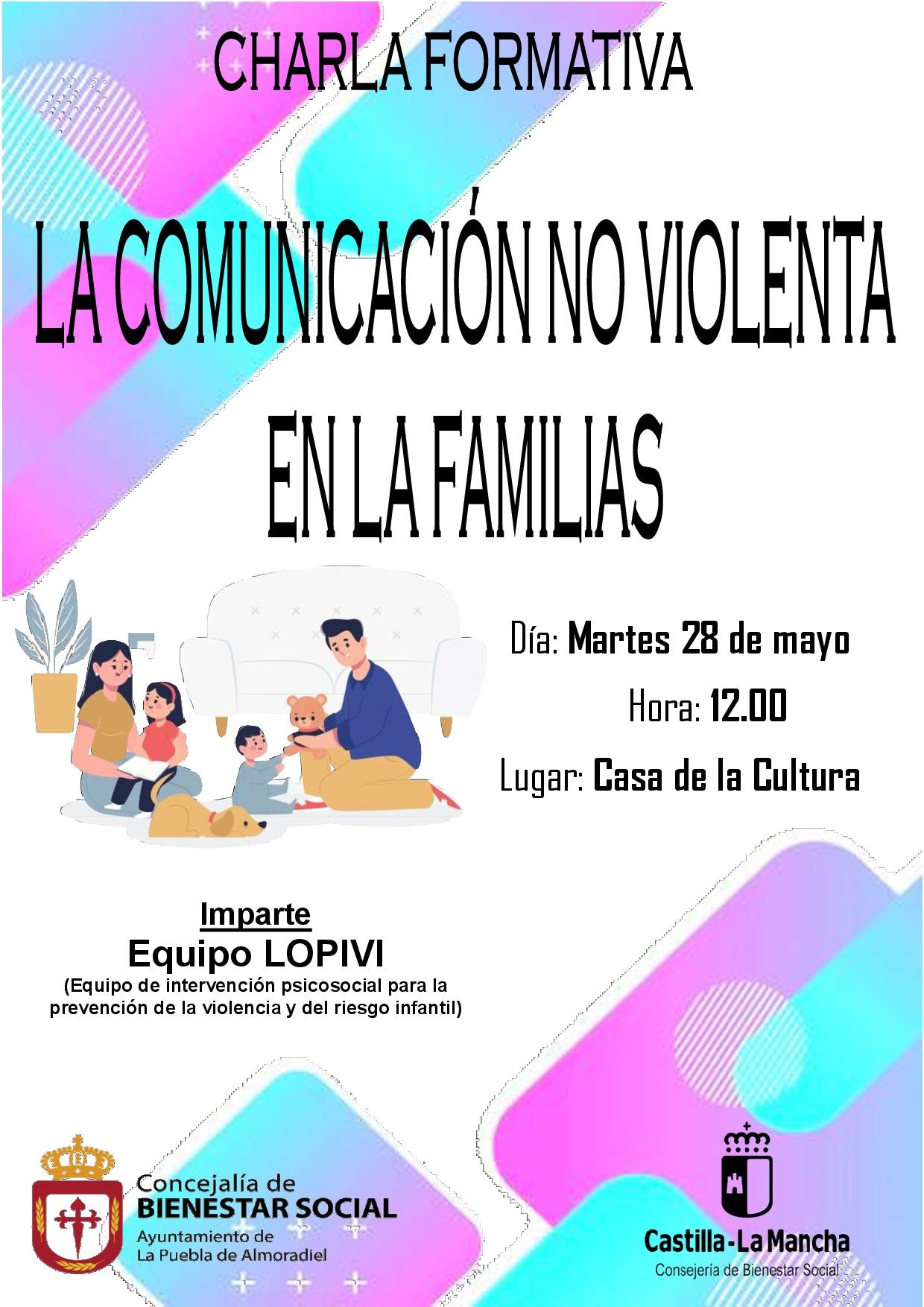 El próximo martes 28 de mayo, la Concejalía de Bienestar Social del Ayuntamiento de La Puebla de Almoradiel invita a todas las familias a participar en una charla formativa titulada “La Comunicación No Violenta en la Familia”. Esta actividad se llevará a cabo en la Casa de la Cultura a partir de las 12:00 horas y será impartida por el equipo LOPIVI, un grupo especializado en intervención psicosocial para la prevención de la violencia y del riesgo infantil.
