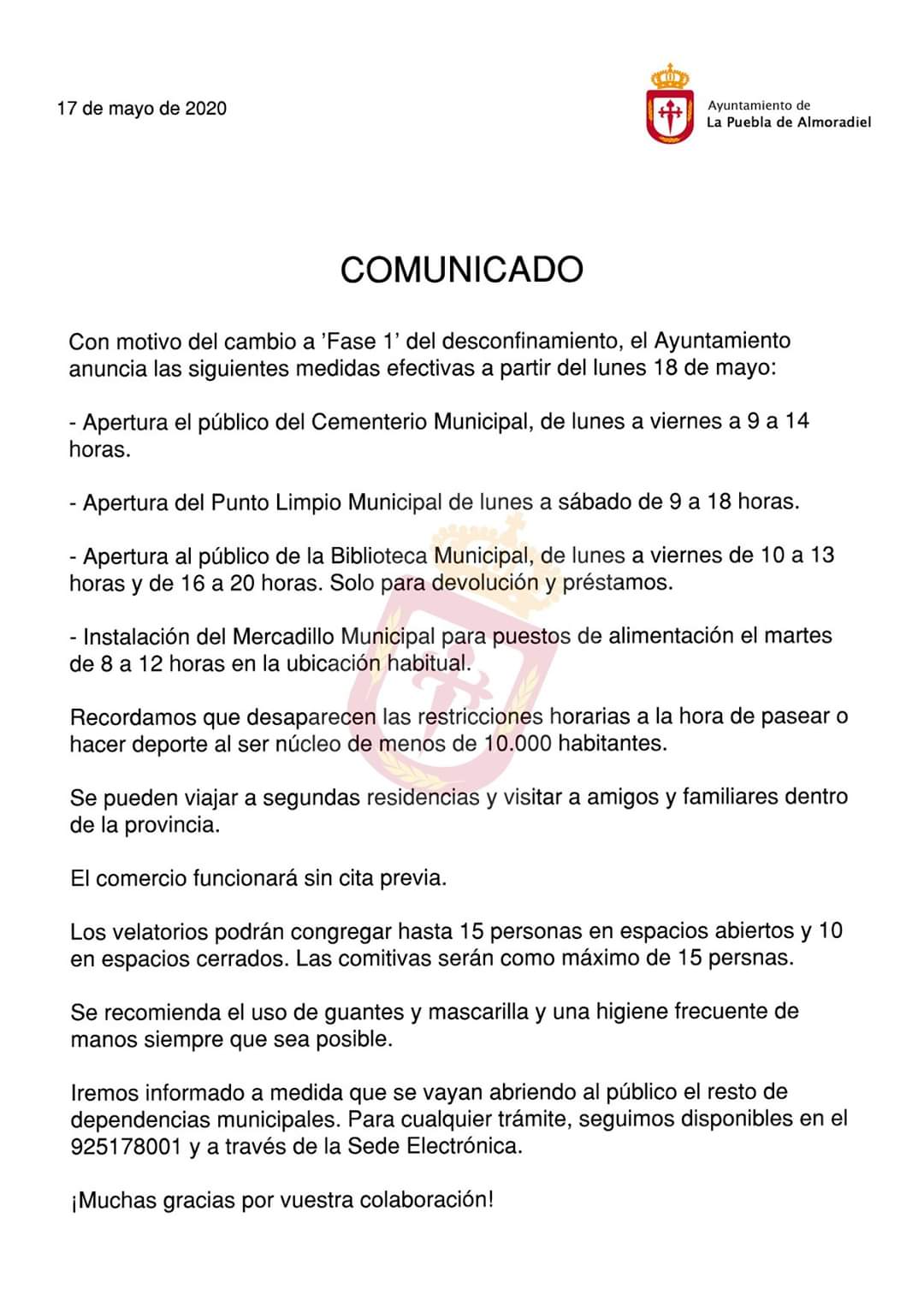 Comunicado sobre el cambio a la Fase 1 de desconfinamiento