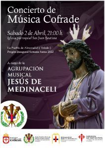 El próximo sábado, 2 de abril, a las 21:00 h. en la Iglesia parroquial San Juan Bautista la Agrupación Musical Jesús de Medinaceli celebrará un Concierto de Música Cofrade, además de realizarse el pregón inaugural Semana Santa 2022