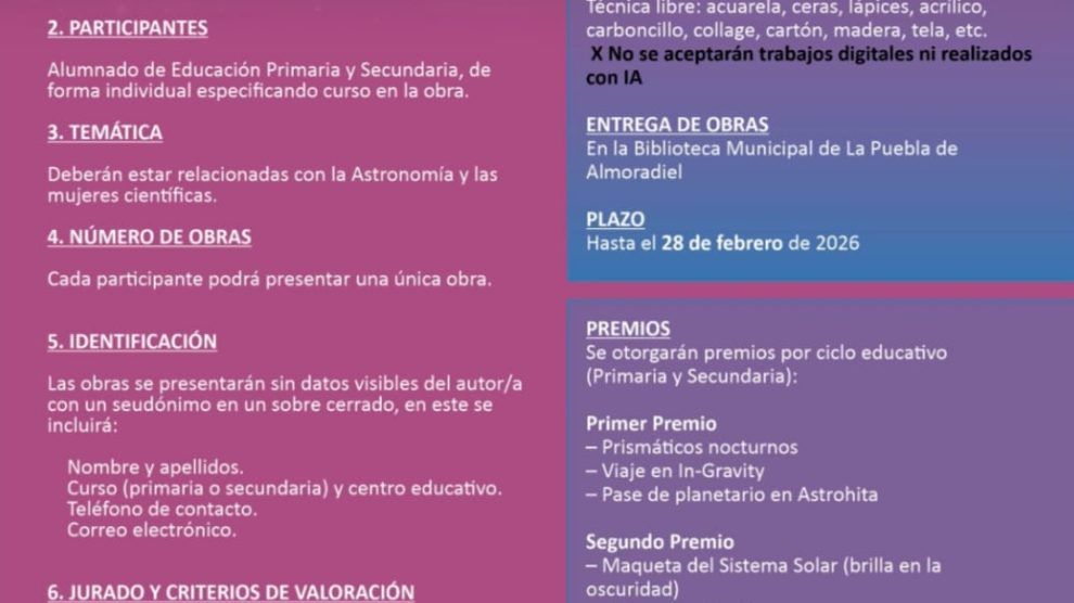 El certamen está dirigido al alumnado de Educación Primaria y Secundaria, que podrá participar con un dibujo realizado a mano y relacionado con astrónomas, científicas, investigadoras o exploradoras del cosmos, tanto históricas como contemporáneas. Cada participante podrá presentar una única obra, que deberá entregarse en la Biblioteca Municipal de La Puebla de Almoradiel.