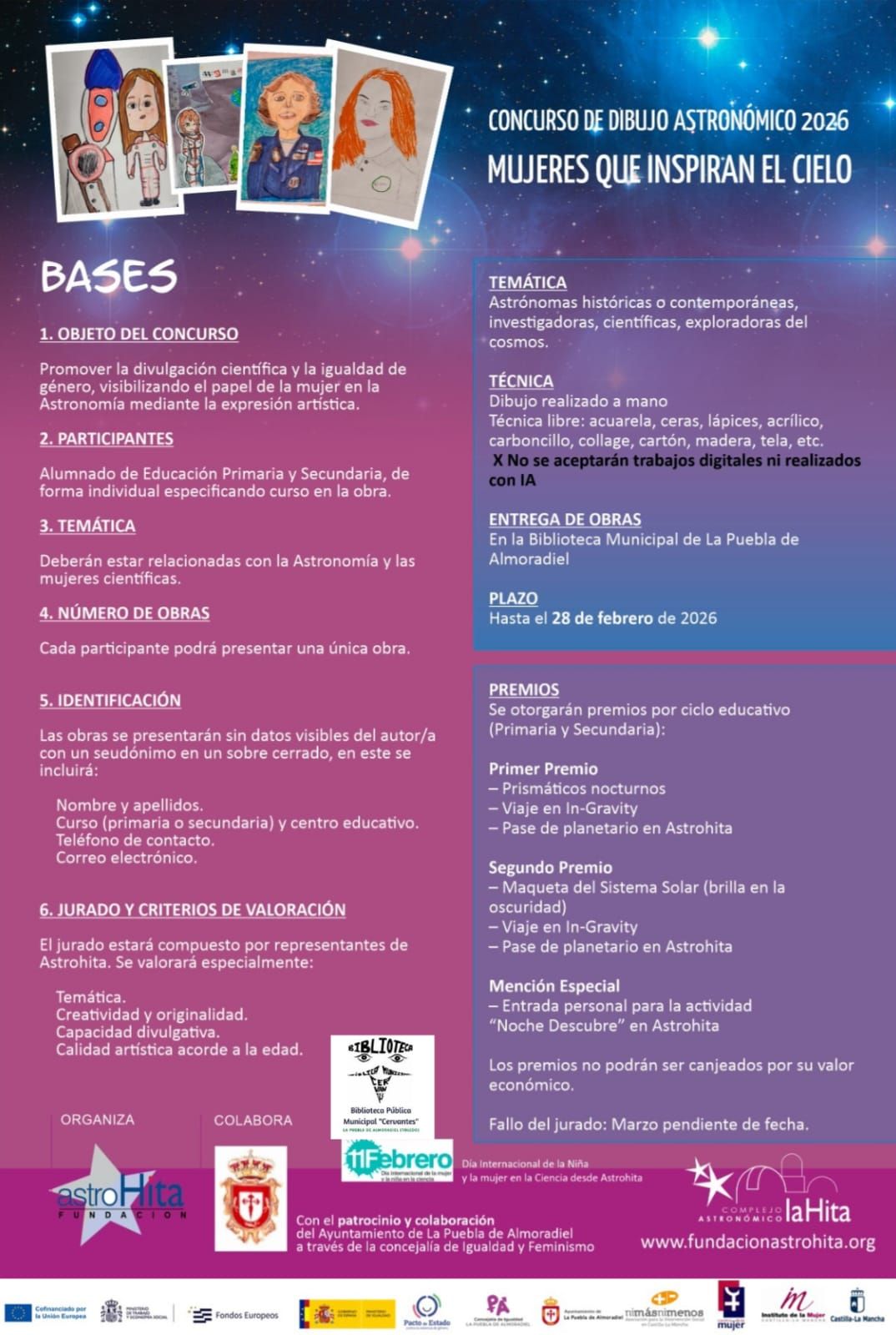 Con motivo del Día Internacional de la Mujer y la Niña en la Ciencia (11F), el Ayuntamiento de La Puebla de Almoradiel y el Complejo Astronómico La Hita (Astrohita) convocan el Concurso de Dibujo Astronómico 2026, bajo el lema “Mujeres que inspiran el cielo”.