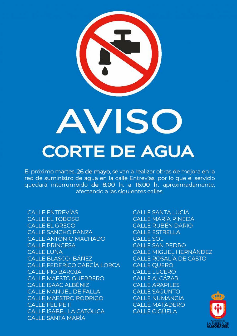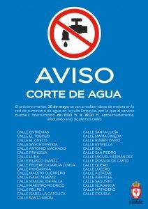 El próximo martes, 26 de mayo, se van a realizar obras de mejora en la red de suministro de agua en la calle Entrevías, por lo que el servicio quedará interrumpido de 8:00 h. a 16:00 h. aproximadamente