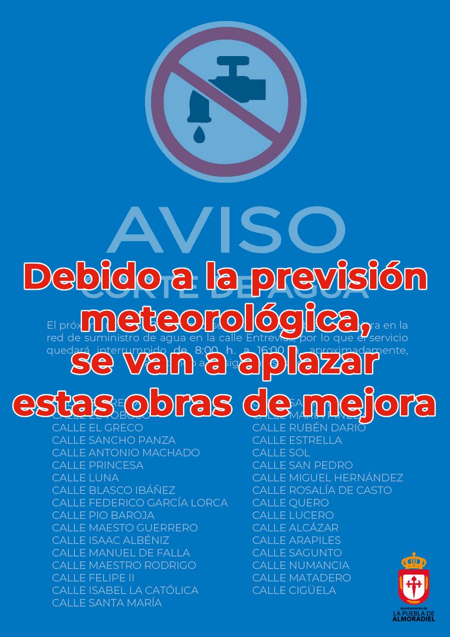 El próximo martes, 12 de mayo, se van a realizar obras de mejora en la red de suministro de agua en la calle Entrevías, por lo que el servicio quedará interrumpido de 8:00 h. a 16:00 h. aproximadamente, afectando a las siguientes calles: