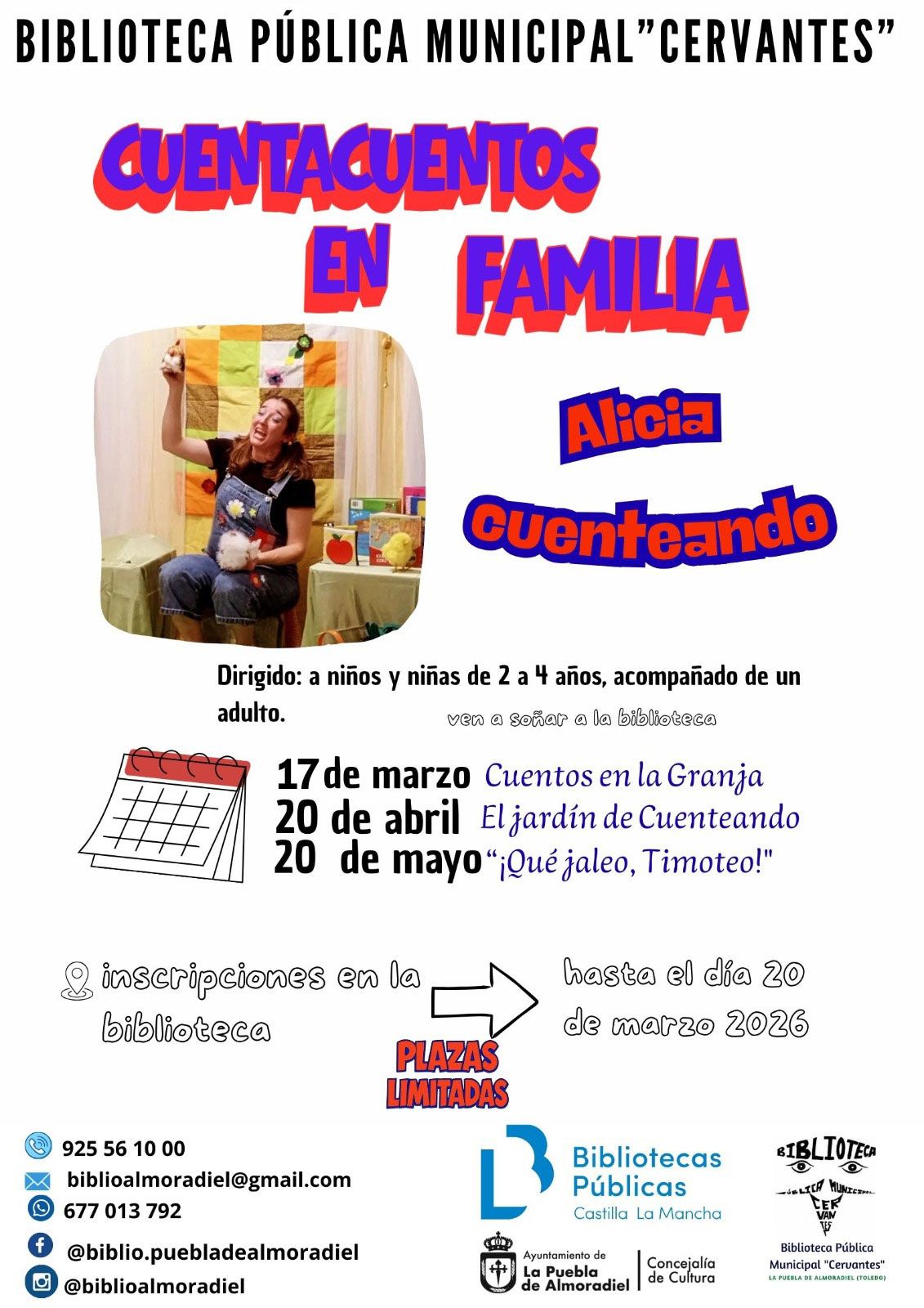 La Biblioteca Pública Municipal “Cervantes” de La Puebla de Almoradiel pone en marcha la actividad “Cuentacuentos en familia”, una propuesta dirigida a niños y niñas de 2 a 4 años acompañados de un adulto, con el objetivo de fomentar la lectura desde las primeras edades y compartir momentos en torno a los cuentos.