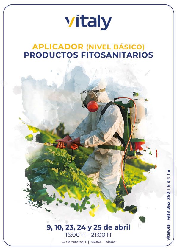 Curso de aplicador (nivel básico) de productos fitosanitarios. Días: 9, 10, 23, 24 y 25 de abril, de 16:00 a 21:00h.