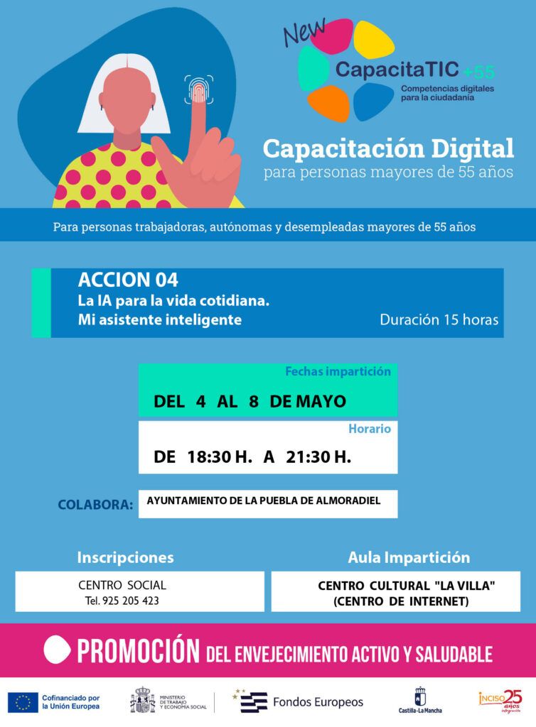 El Ayuntamiento de La Puebla de Almoradiel colabora en una nueva acción formativa dirigida a mejorar las competencias digitales de la ciudadanía mayor de 55 años. Bajo el título “La IA para la vida cotidiana. Mi asistente inteligente”, este curso práctico permitirá a los participantes descubrir cómo la inteligencia artificial puede convertirse en una herramienta útil en su día a día.