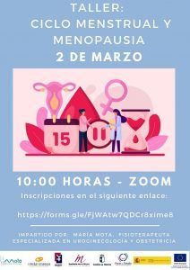 El Taller de Ciclo Menstrual y Menopausia que tendrá lugar el día 2 de Marzo, a las 10:00 horas a través de la plataforma Zoom, yserá impartido por María Mota, fisioterapeuta especializada en uroginecología y obstetricia