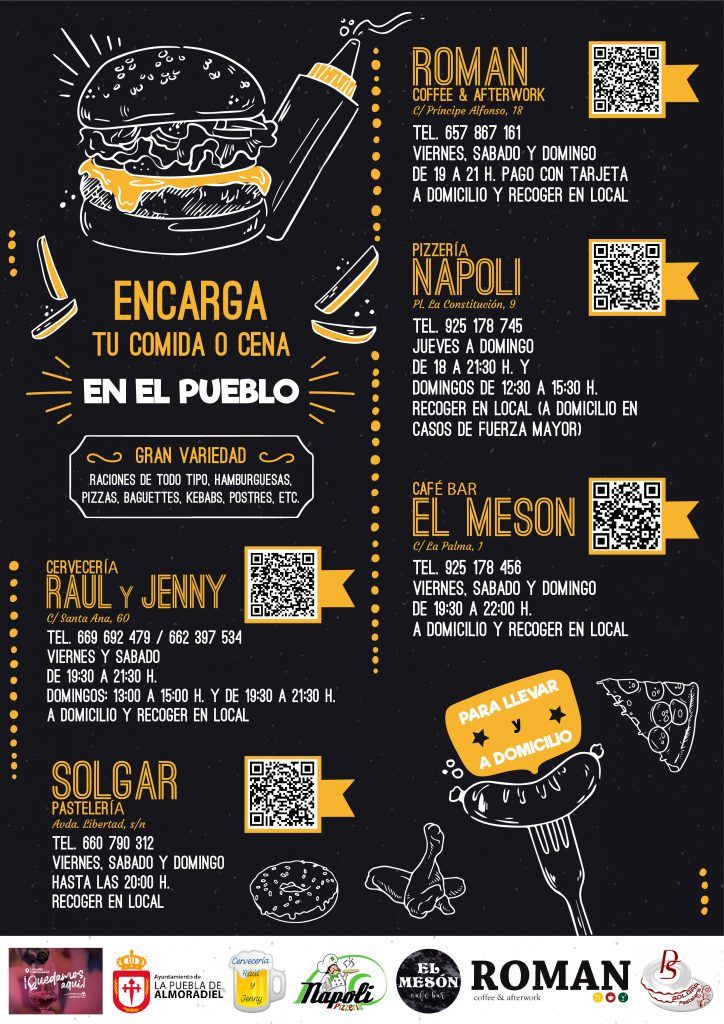 Algunos de nuestros locales de hostelería reformulan su servicio y ponen a disposición del cliente una amplia variedad de productos como raciones de todo tipo, hamburguesas, pizzas, kebabs, postres, etc. debidamente preparados para recoger y comer en el calor del hogar, o incluso te lo llevan a casa!