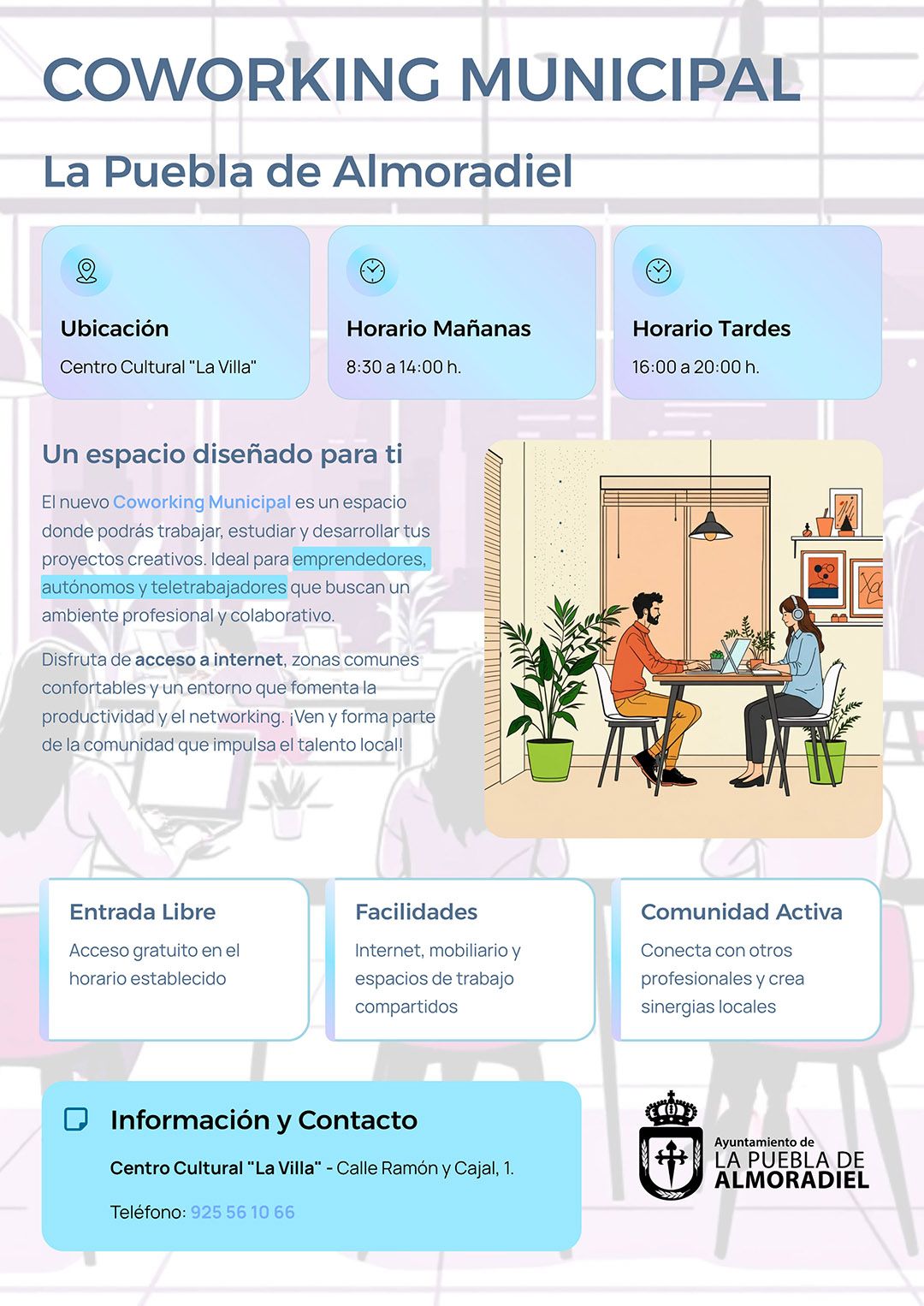 El Ayuntamiento de La Puebla de Almoradiel ha puesto en marcha un nuevo Coworking Municipal, un espacio pensado para facilitar el trabajo, el estudio y el desarrollo de proyectos profesionales en un entorno cómodo y colaborativo.