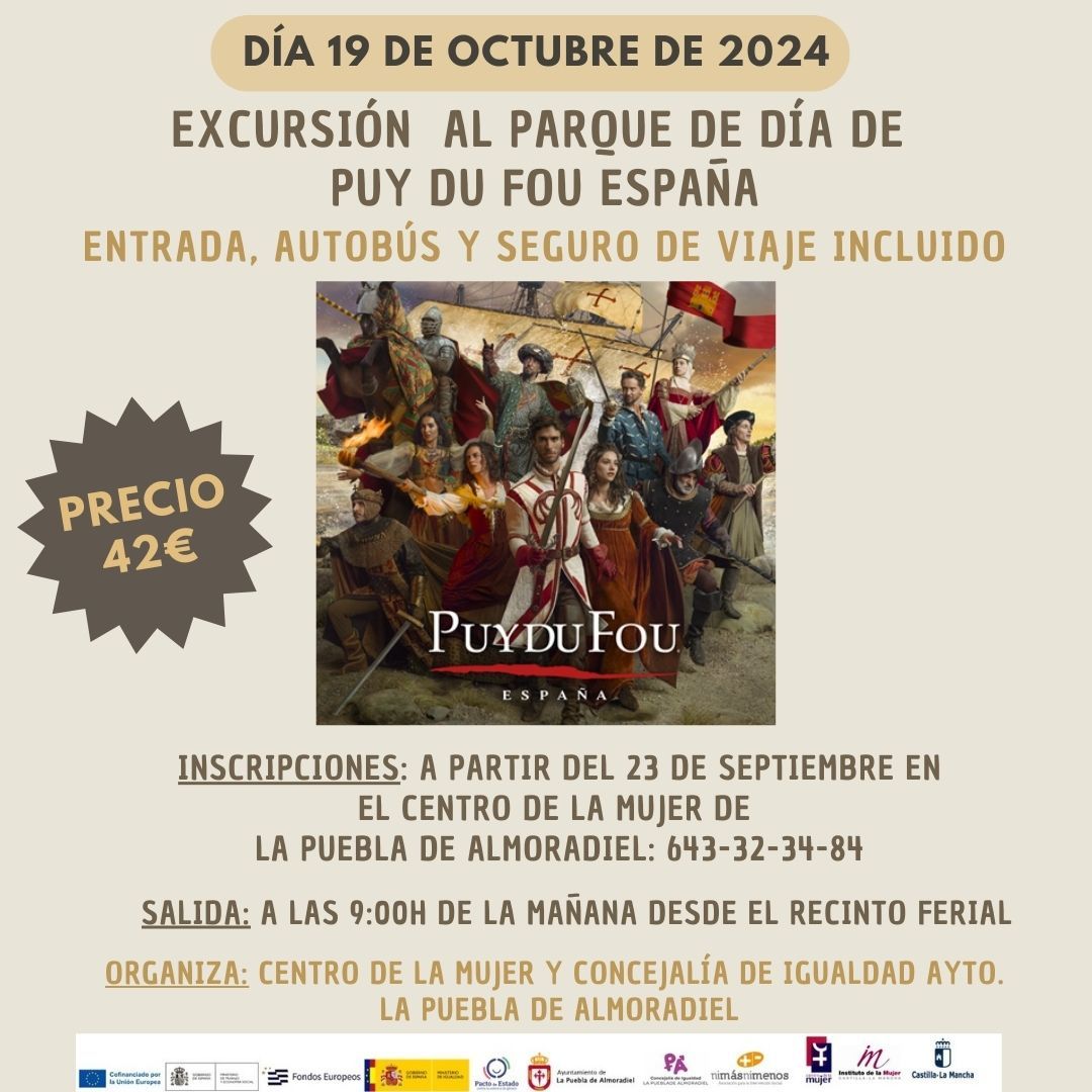 El próximo 19 de octubre de 2024, el Centro de la Mujer y la Concejalía de Igualdad del Ayuntamiento de La Puebla de Almoradiel organizan una emocionante excursión al parque temático Puy du Fou España, en Toledo. Esta es una excelente oportunidad para disfrutar de un día lleno de historia, entretenimiento y cultura en uno de los parques más espectaculares de nuestro país, ideal para todas las edades