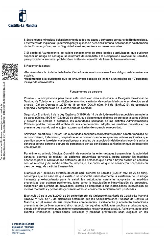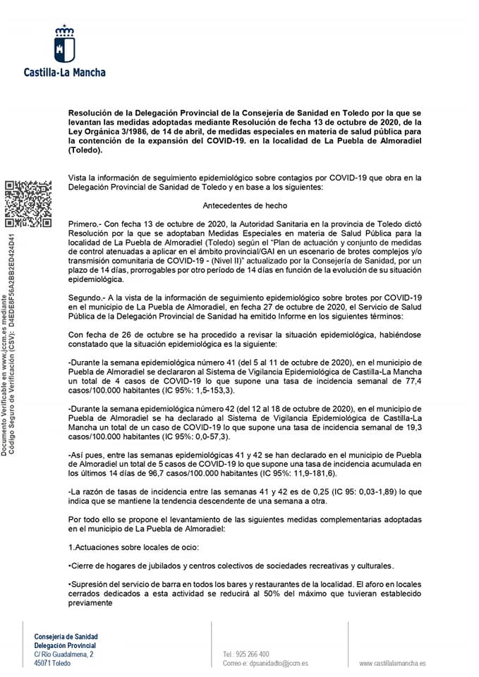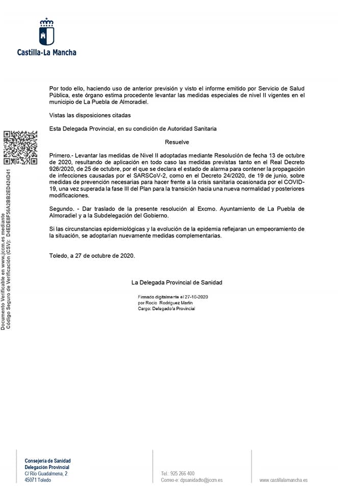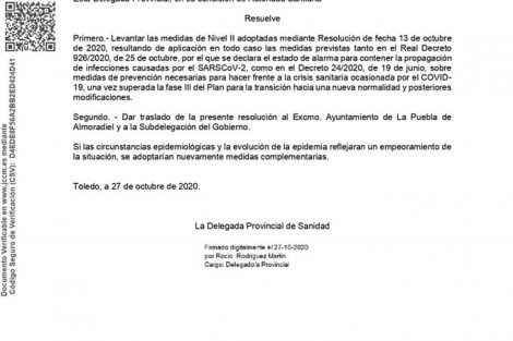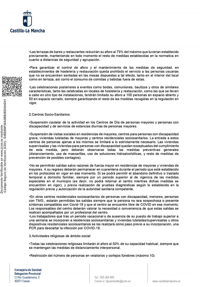 Se levantan las últimas medidas y se encuentran vigentes las recogidas en el Real Decreto 926/2020 del 25 de octubre de declaración del Estado de Alarma y el Decreto 49/2020 del 21 de agosto de Castilla-La Mancha, sobre medidas de prevención necesarias para hacer frente a la crisis sanitaria.