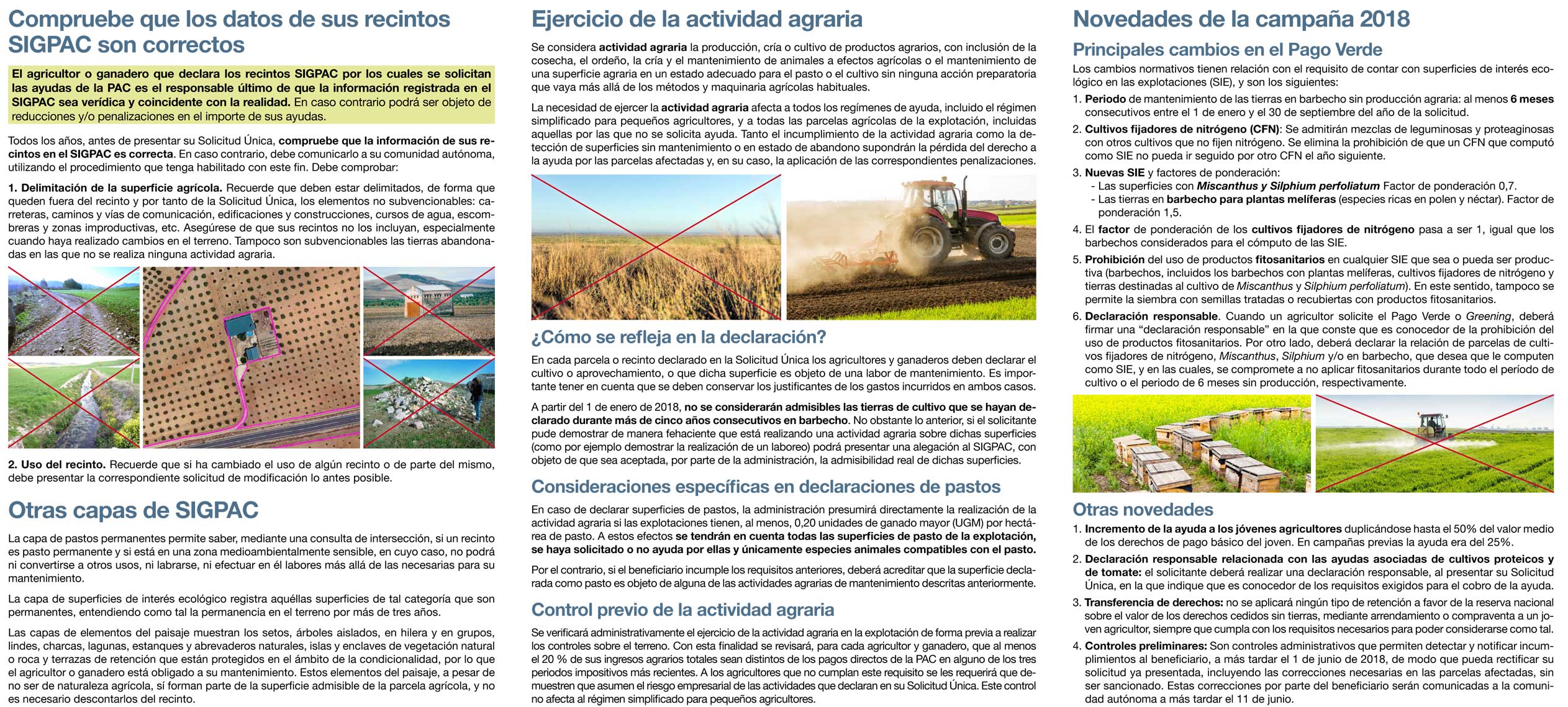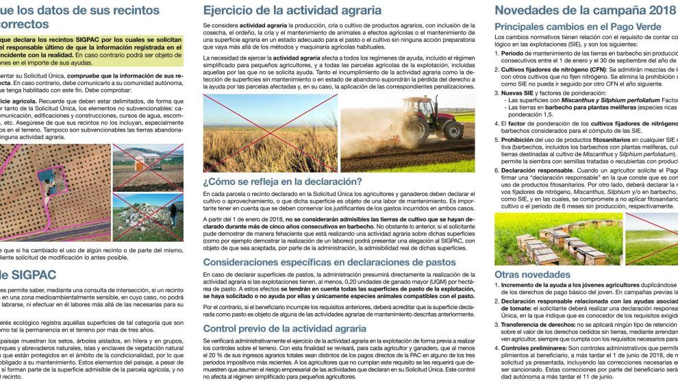 Del mismo modo, en el folleto, se ha incidido de forma especial en la importancia del cumplimiento del requisito de ejercer la actividad agraria, indicándose las actuaciones que afectan al ámbito declarativo como el enfoque previsto desde el punto de vista de los controles a realizar.