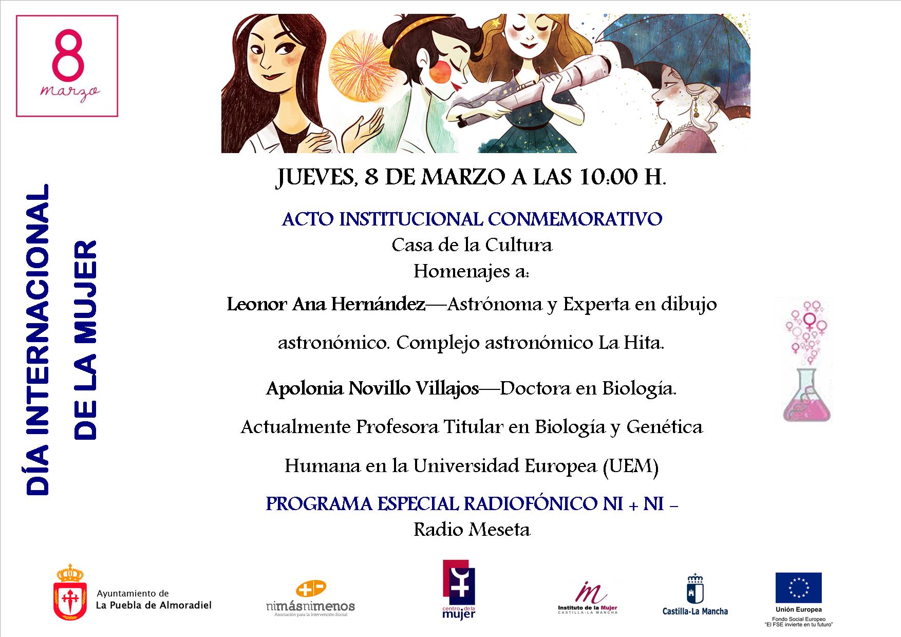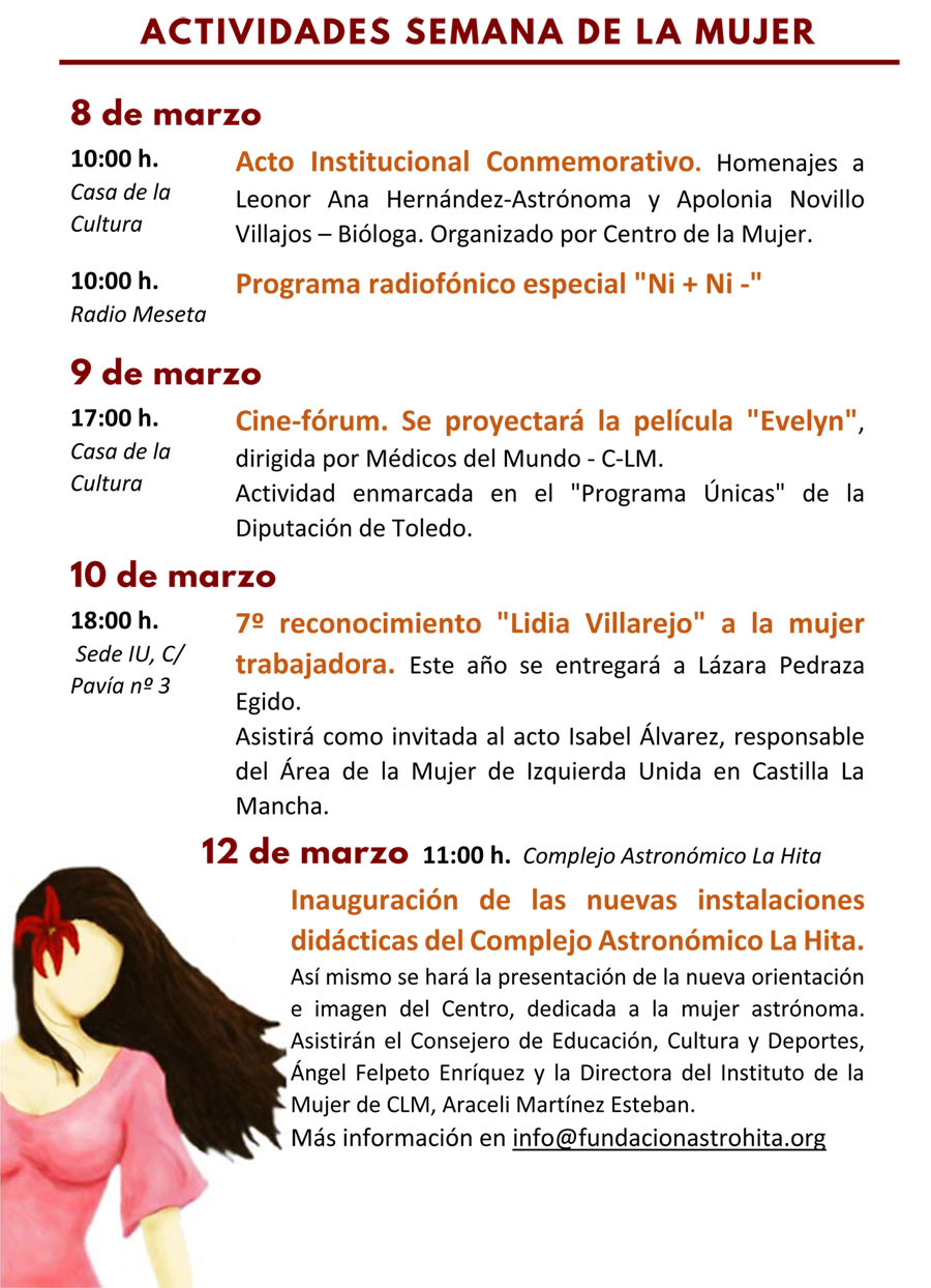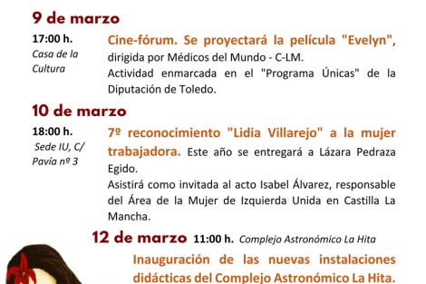 Del 8 al 12 de marzo se llevarán a cabo actividades desarrolladas por instituciones como el Centro de la Mujer, Diputación de Toledo, Fundación Astro Hita o el Ayuntamiento entre otras.