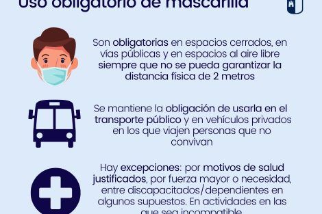 Recordar que sigue siendo obligatorio el uso de mascarilla en los momentos en los que no estemos seguros de poder cumplir con la distancia de seguridad.