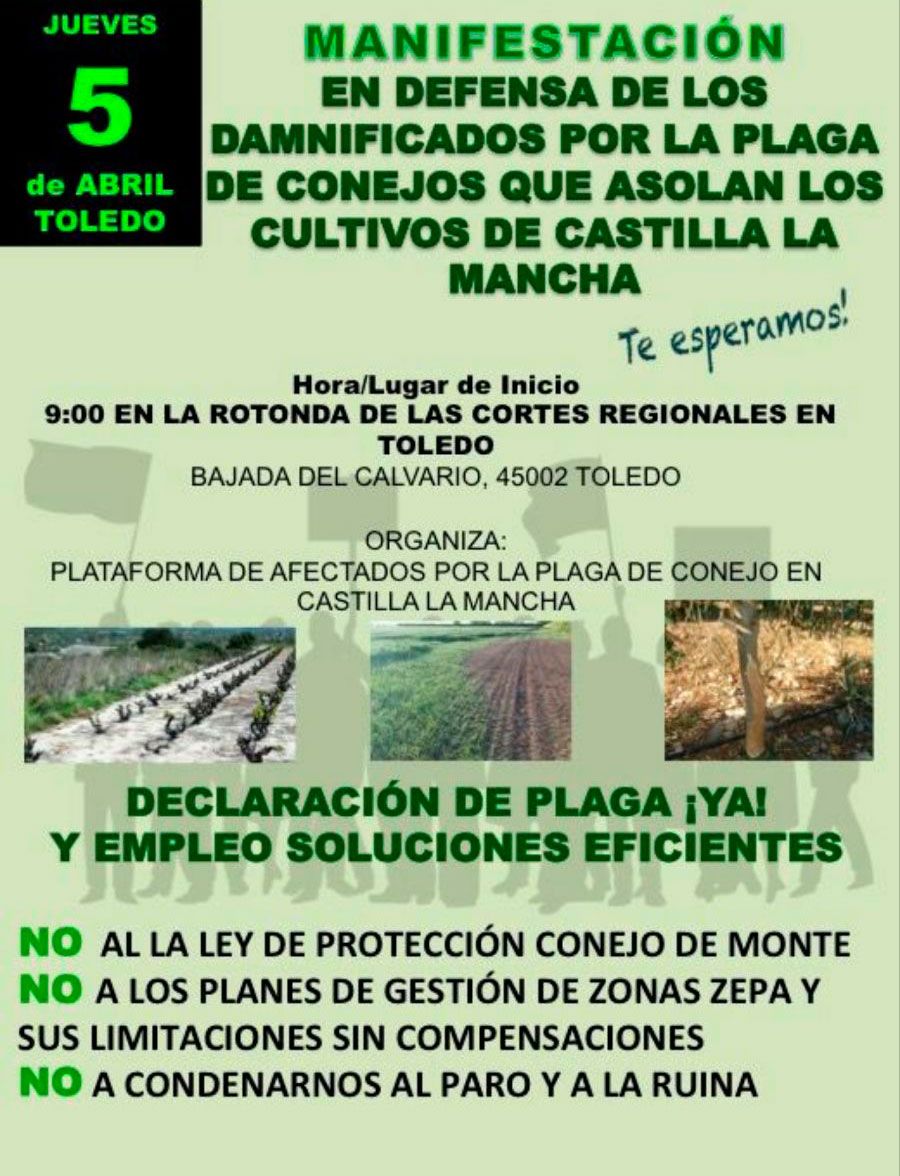 Agricultores de las provincias castellano-manchegas de Albacete, Ciudad Real, Cuenca y Toledo, principalmente de la comarca de La Mancha, saldrán este jueves a la calle en Toledo para protestar por la falta de medidas efectivas para luchar contra la plaga de conejos “que está arrasando todos los cultivos”.