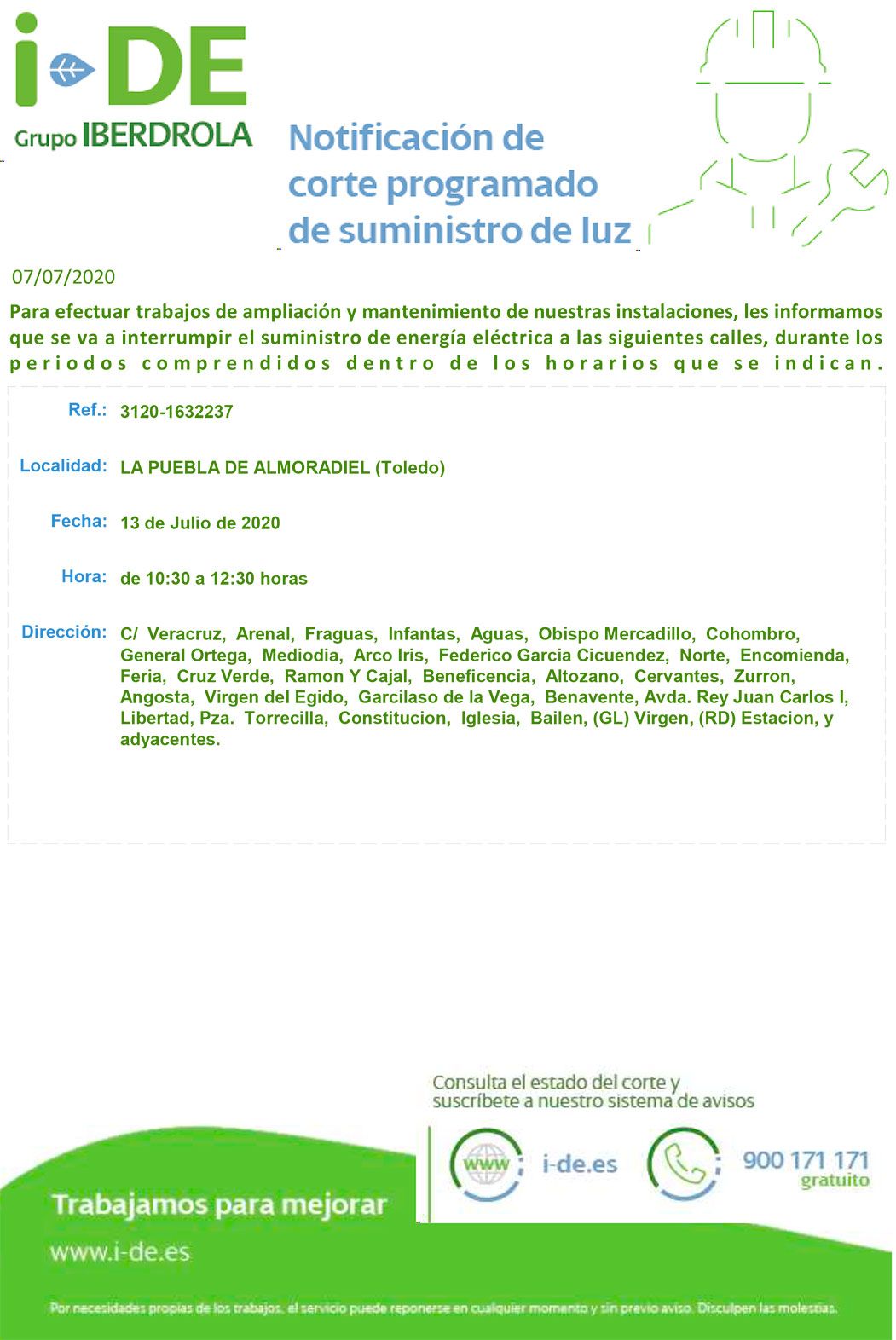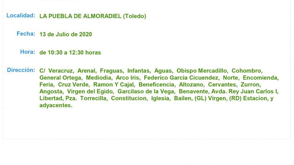 Iberdrola informa que para efectuar trabajos de ampliación y mantenimiento de sus instalaciones, se va a interrumpir el suministro de energía eléctrica a las siguientes calles, durante los períodos comprendidos dentro de los horarios que se indican: