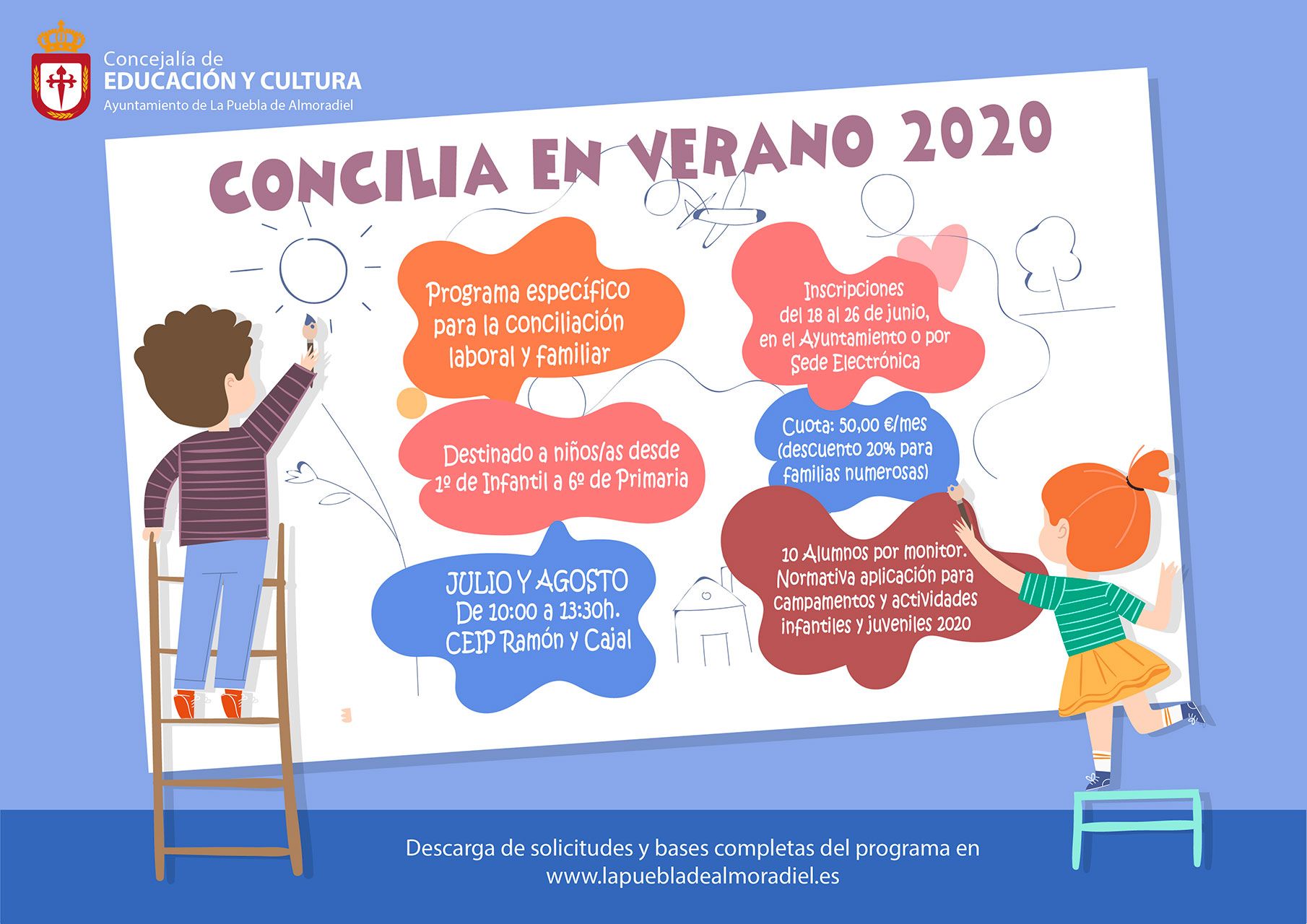 El programa “Concilia en verano 2020”, se presenta como un conjunto de actividades para el ocio y tiempo libre para los meses de julio y agosto en La Puebla de Almoradiel. El objetivo fundamental es ofrecer este servicio que ayude a las familias a conciliar la vida familiar y laboral.