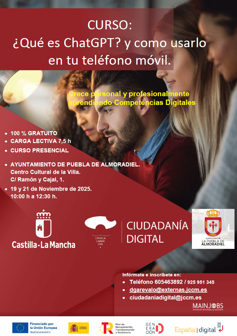 Los días 19 y 21 de Noviembre de 2025 se realizará un curso presencial gratuito para descubrir ChatGPT y como usarlo en tu teléfono móvil.