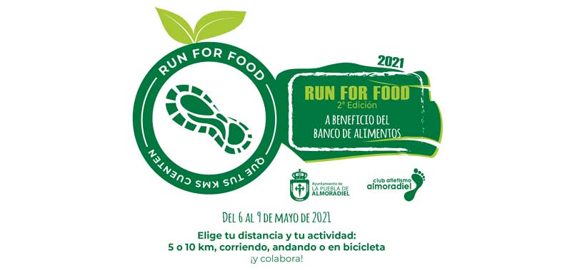“RUN FOR FOOD, que tus kms cuenten” es una iniciativa deportiva solidaria, que se realiza por segundo año consecutivo, con el objetivo principal de conseguir fondos para entidades sociales que trabajen para ayudar a los colectivos más desfavorecidos y en riesgo de exclusión social, concretamente con el Banco de Alimentos de La Puebla de Almoradiel.