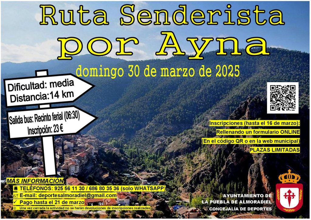 El 30 de marzo, domingo, la Concejalía de Deportes ha organizado una ruta senderista por la localidad albaceteña de Ayna, situada en el corazón de la Sierra del Segura y conocida como la Suiza Manchega.