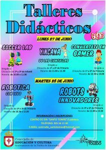 La Concejalía de Educación y Cultura, junto a la Diputación de Toledo organizan los días 27 y 28 de junio, lunes y martes respectivamente, cinco talleres didácticos.