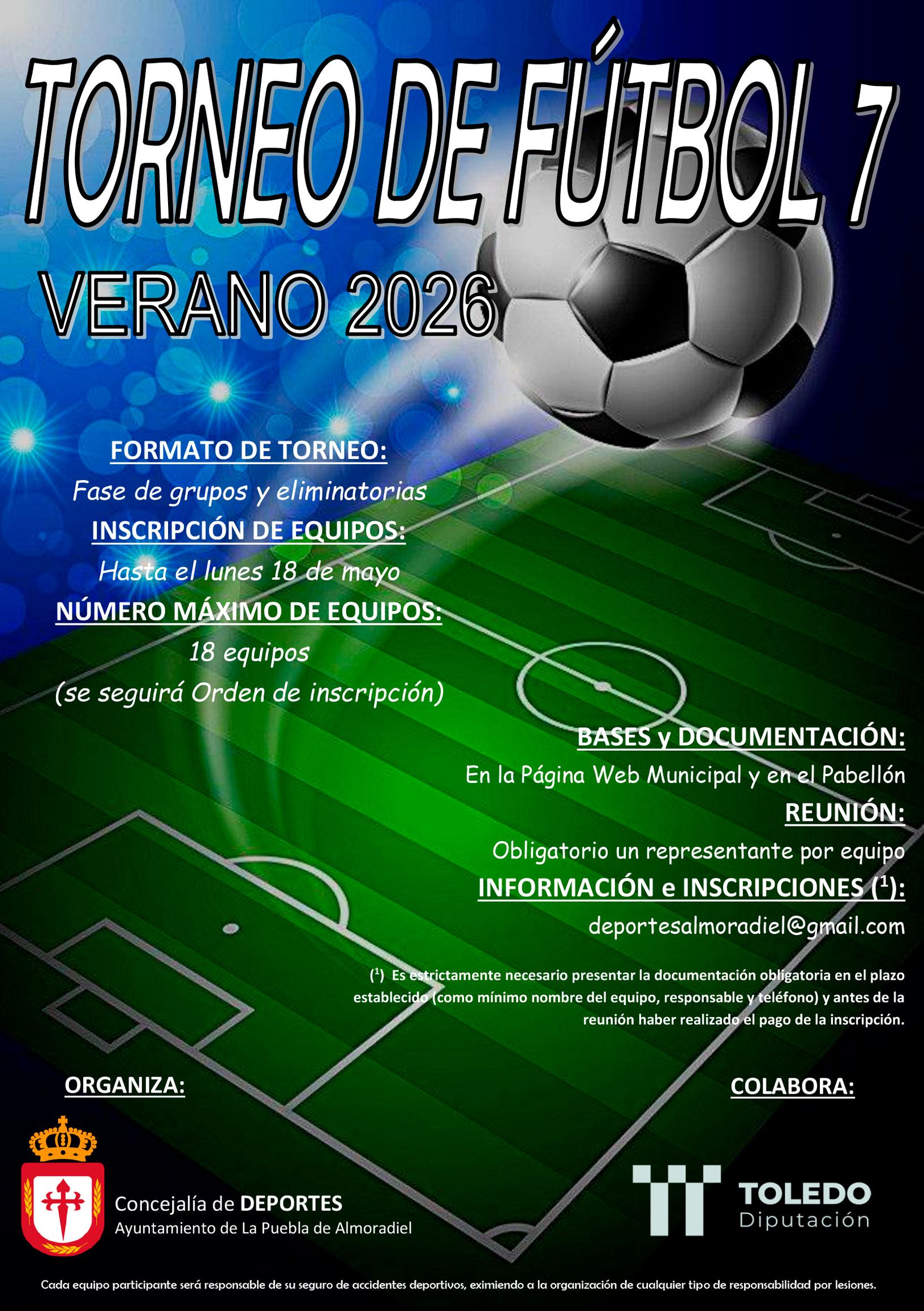 El Ayuntamiento de La Puebla de Almoradiel, a través de la Concejalía de Deportes, lanza una nueva edición del Torneo de Fútbol 7 Verano 2026, una cita deportiva pensada para fomentar la participación, el compañerismo y el deporte durante los meses estivales.