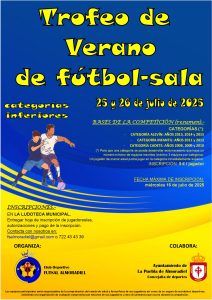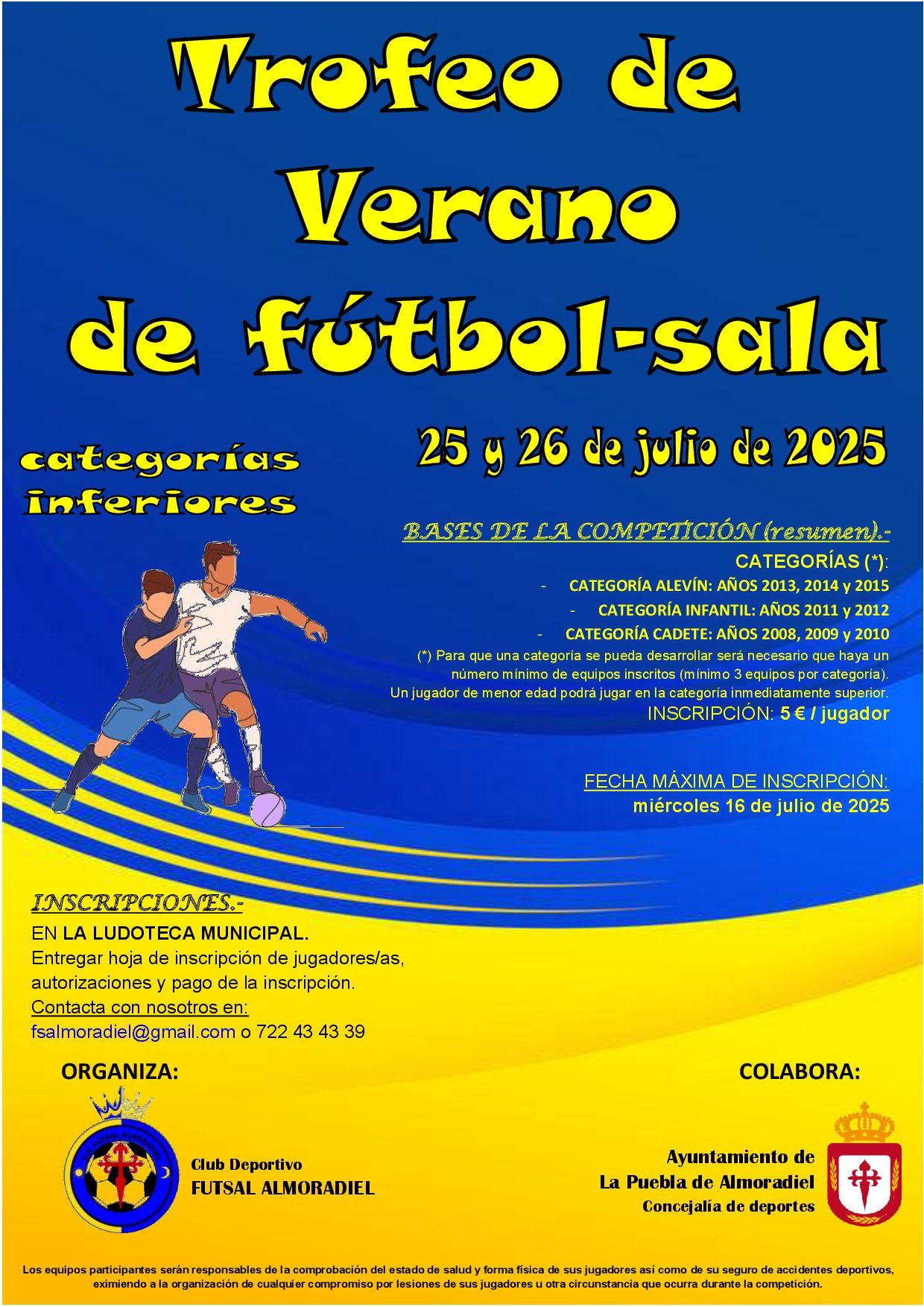 El Club Deportivo Futsal Almoradiel, en colaboración con la Concejalía de Deportes del Ayuntamiento de La Puebla de Almoradiel, organiza el Trofeo de Verano de Fútbol Sala para categorías inferiores los próximos 25 y 26 de julio de 2025.